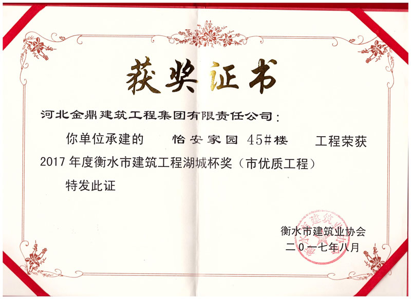 怡安家園45#樓工程榮獲2017年衡水市建筑工程湖城杯獎(市優質工程)